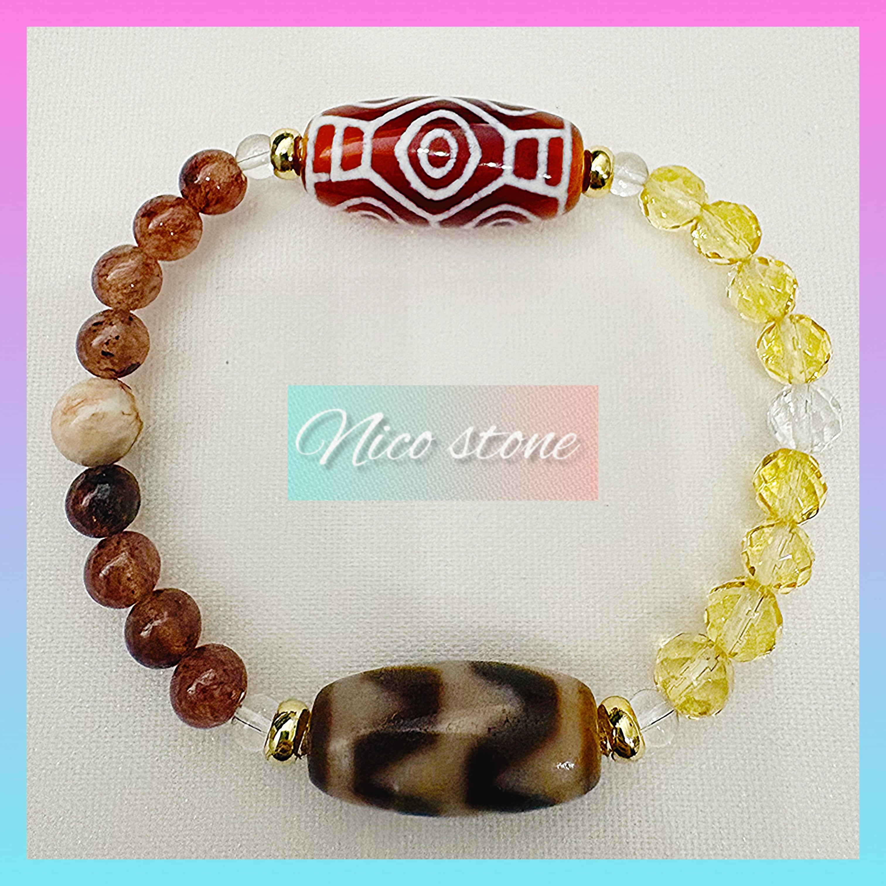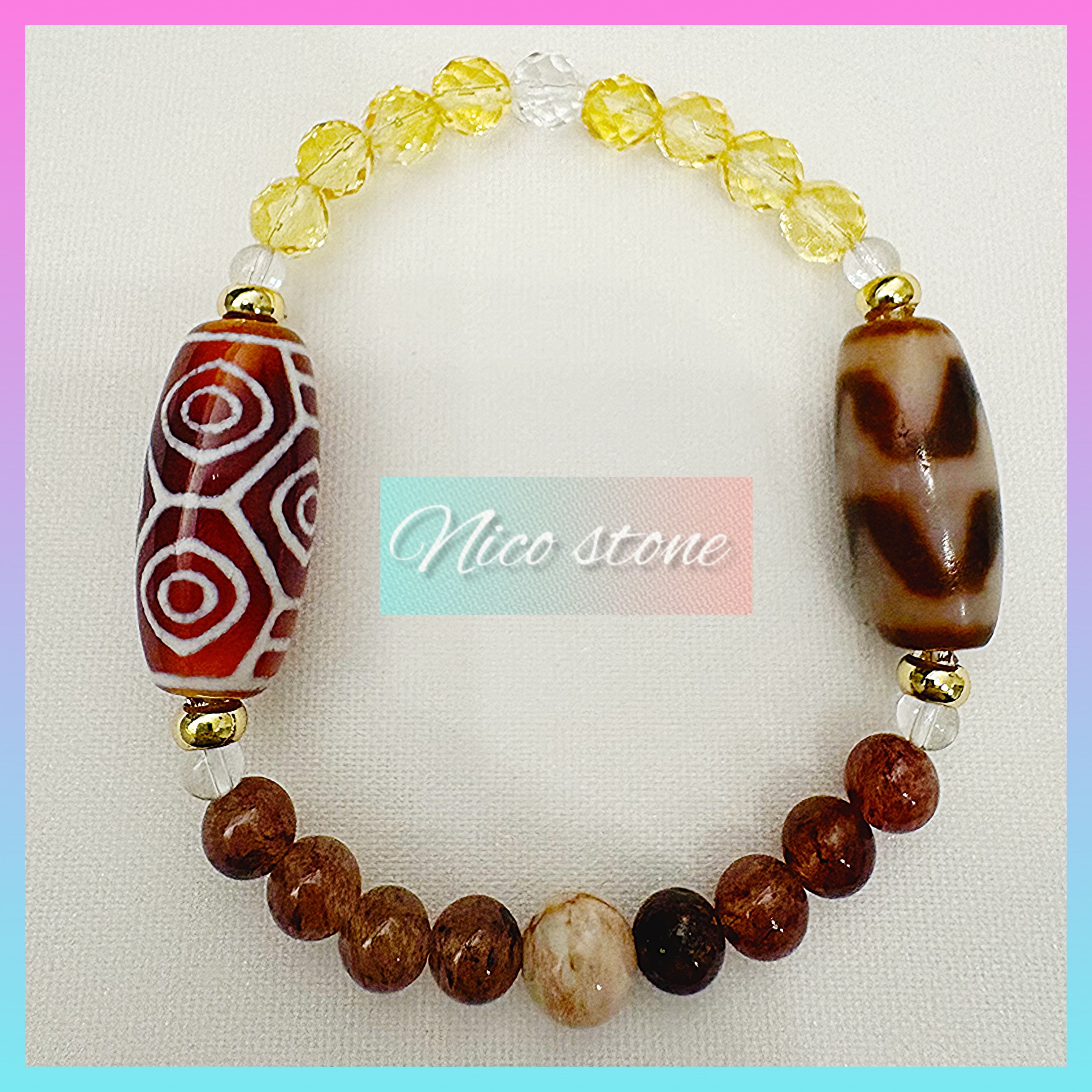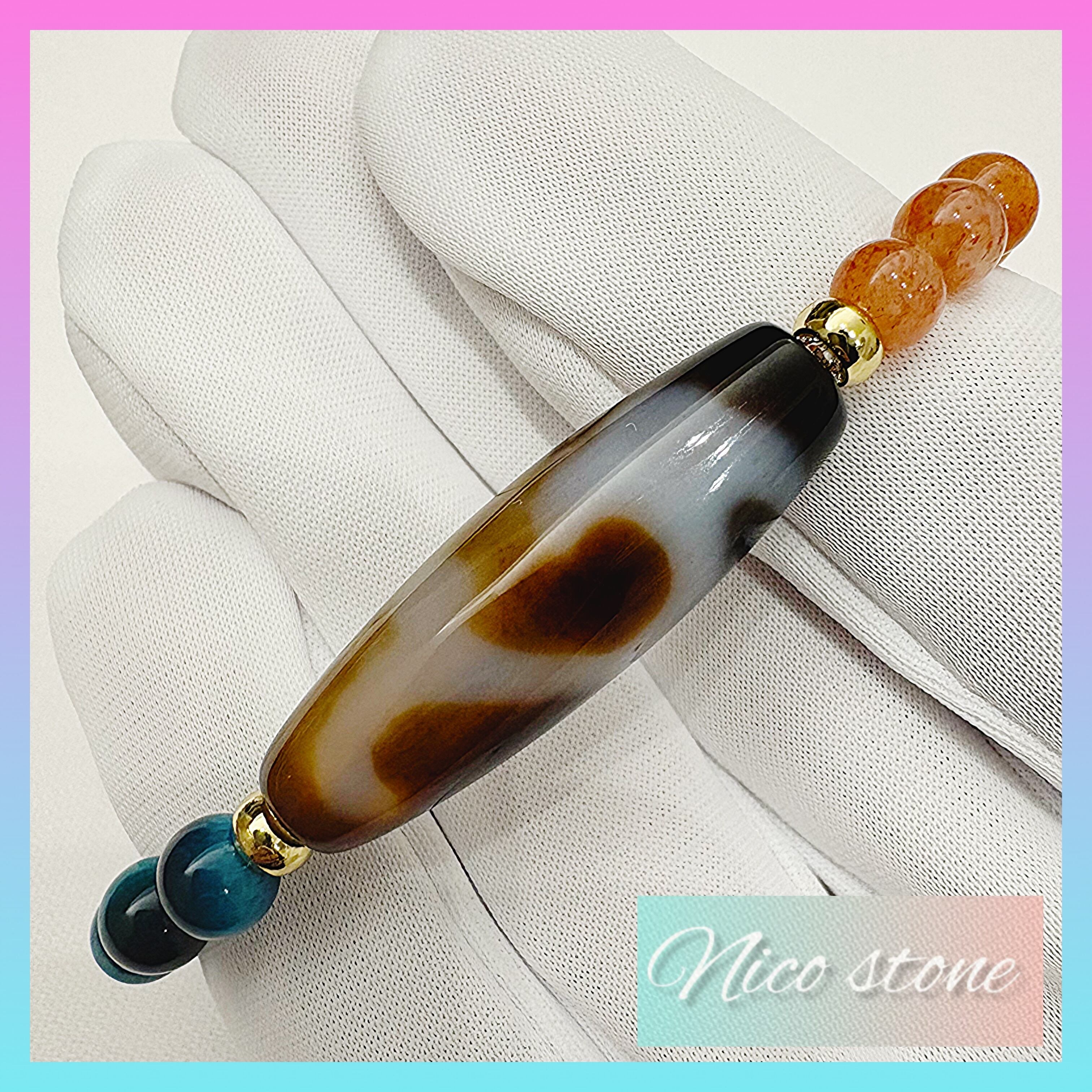 ① 龍眼天珠(チベット老玉髄)・虎牙天珠(紅朱砂・馬蹄痕天珠)ブレスレット