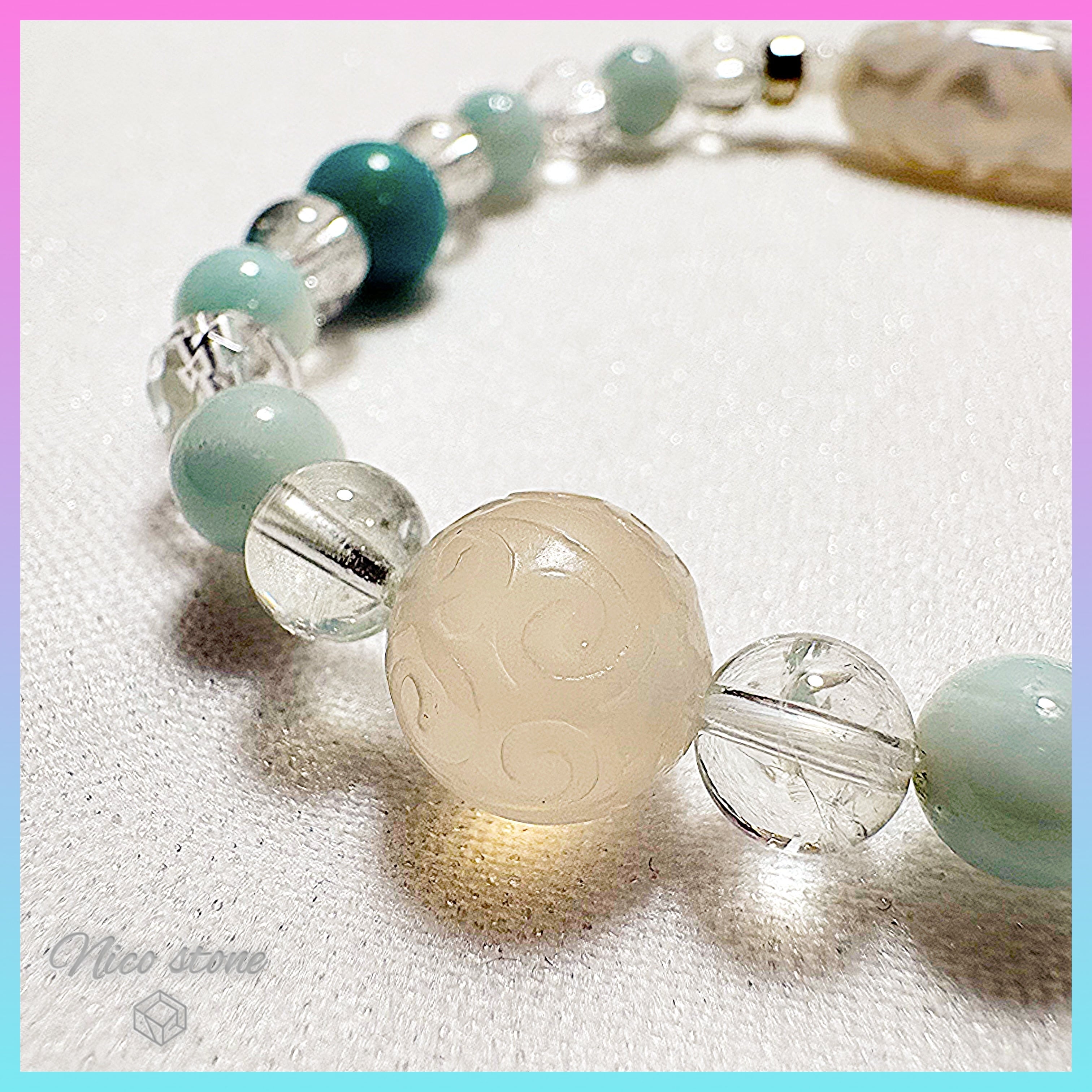 優しいグリーンのプラシオライトが心身を癒し、ムーンストーンが直感力と女性らしい柔らかなエネルギーをサポートします。