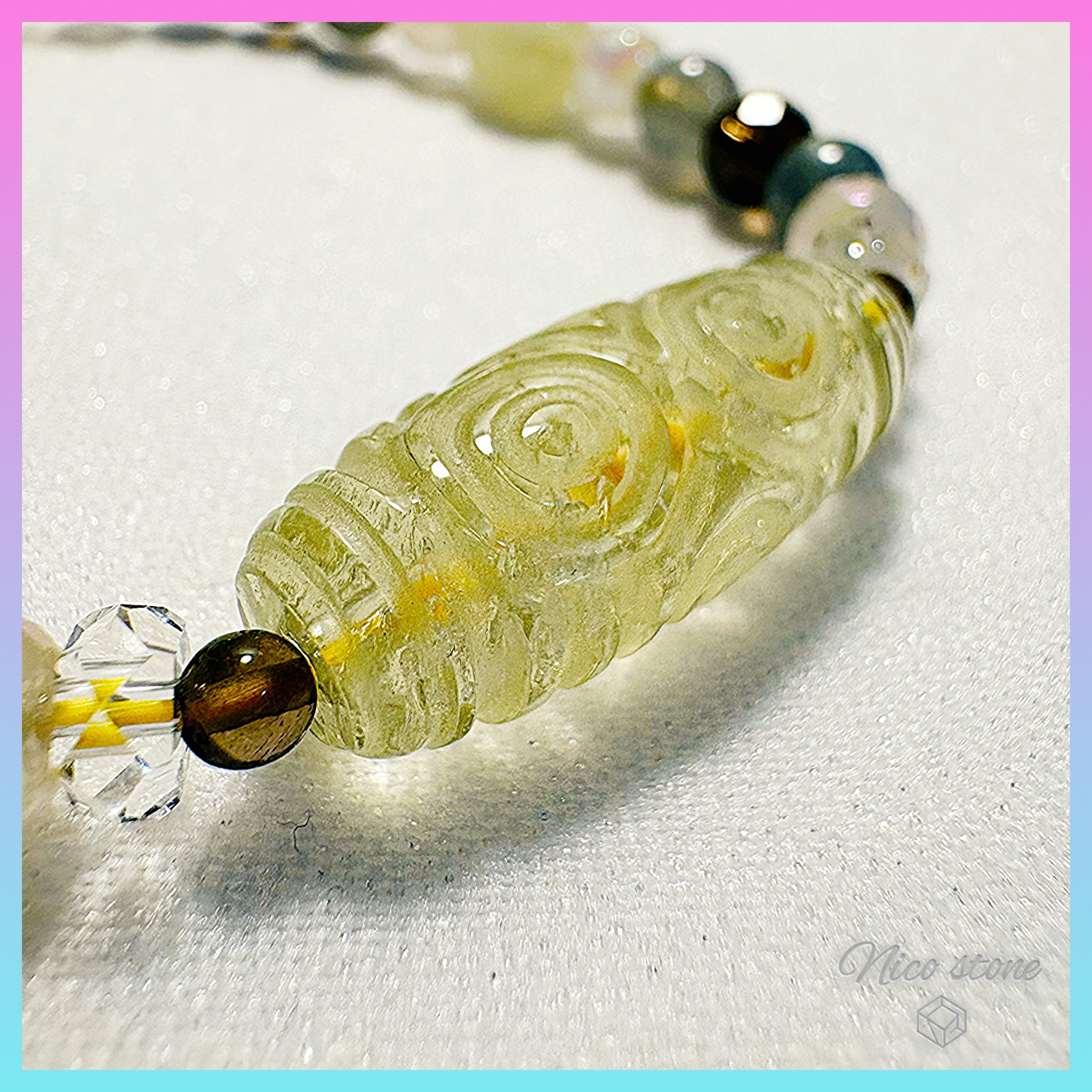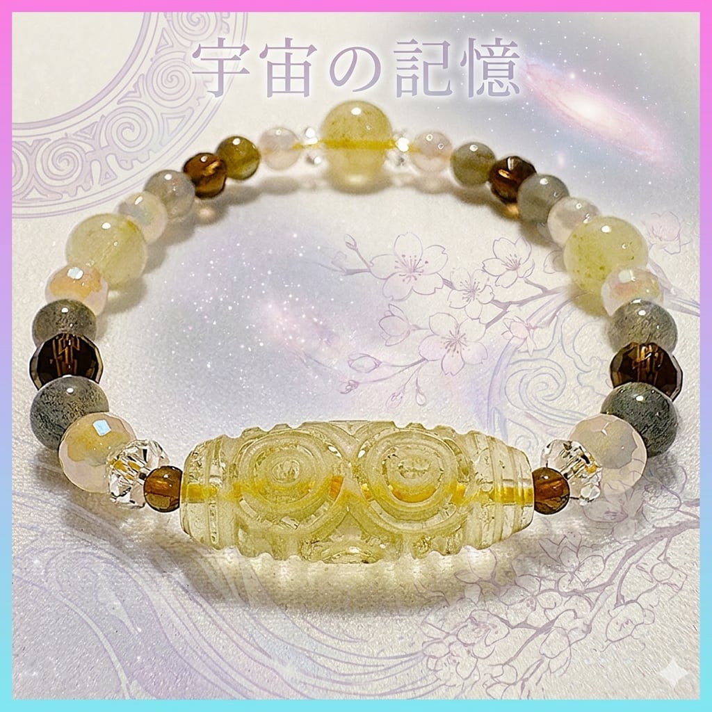 希少なリビアングラスを贅沢に削り出して作られた「龍眼天珠」を主役にした、特別なヒーリングブレスレットです。