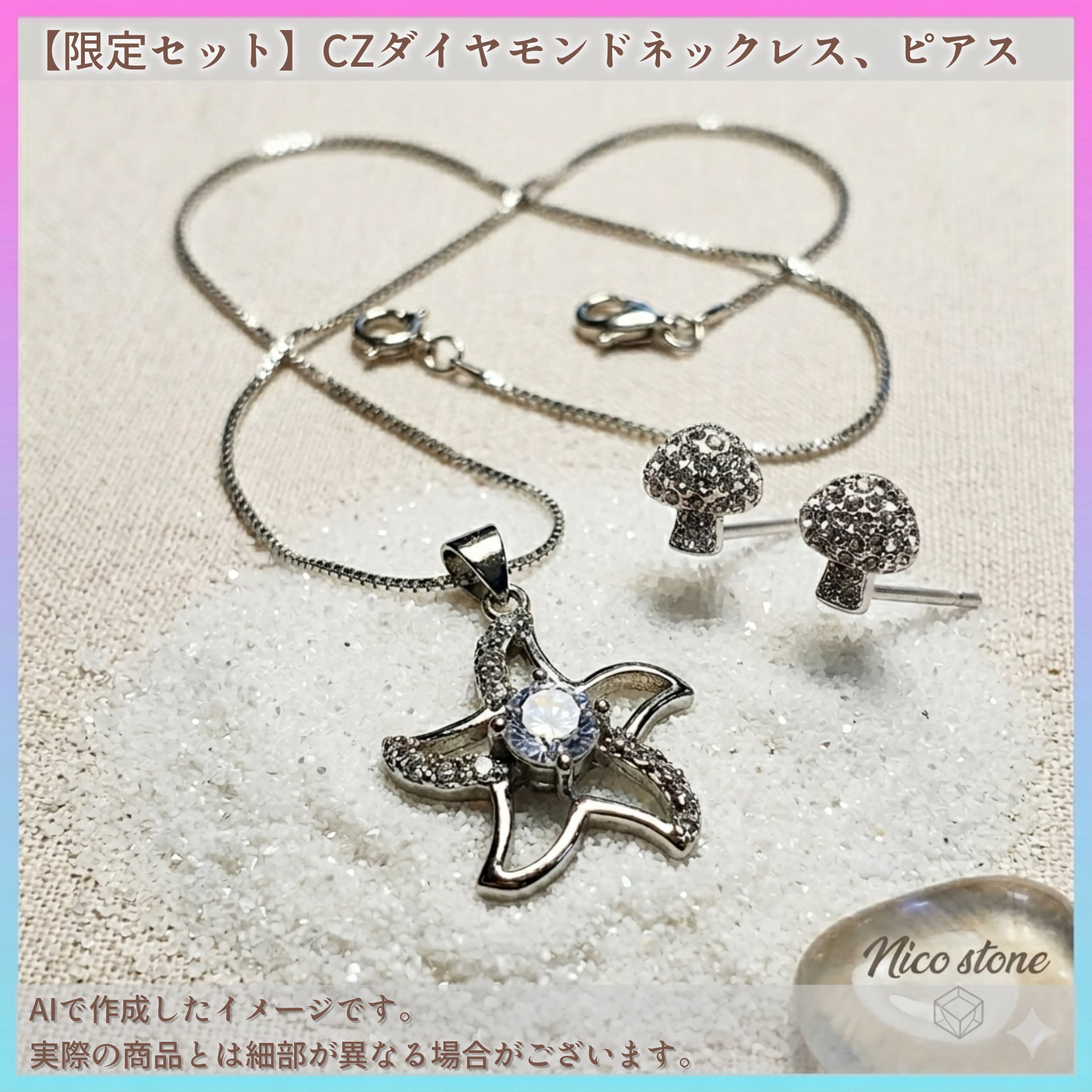 【SV925】星の瞬きとキノコの遊び心。CZダイヤモンド ネックレス&ピアス セット(40cmチェーン付)